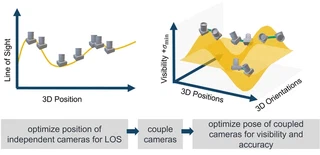 The surge in industrial robots performing high-accuracy tasks like milling and spray painting necessitates effective error compensation methods. External tracker hardware has been traditionally employed, but its cost and limited scalability hinder its effectiveness as accuracy requirements change. This paper proposes a novel optical tracking system using holographic multipoint detection comprised of multiple independently placed cameras. The placement is determined using a novel optimization method that takes into account an error model of the system, the dynamic movement of the robot, and the resulting occlusion of the markers. This optimization algorithm is evaluated on a simulated two-arm robot scenario showing its capability to decrease the triangulation error.